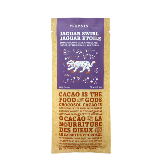 ChocoSol’s multiple award-winning Jaguar chocolate. You and your customers will love the unique flavour and story of these chocolates. Over two decades, the Jaguar project has helped regenerate indigenous forest gardens and traditional knowledge systems. With its uniquely nutty-flavour profile and beautiful golden colour, these bars are a true plant-based “white” chocolate that is equally delicious to eat and drink!
