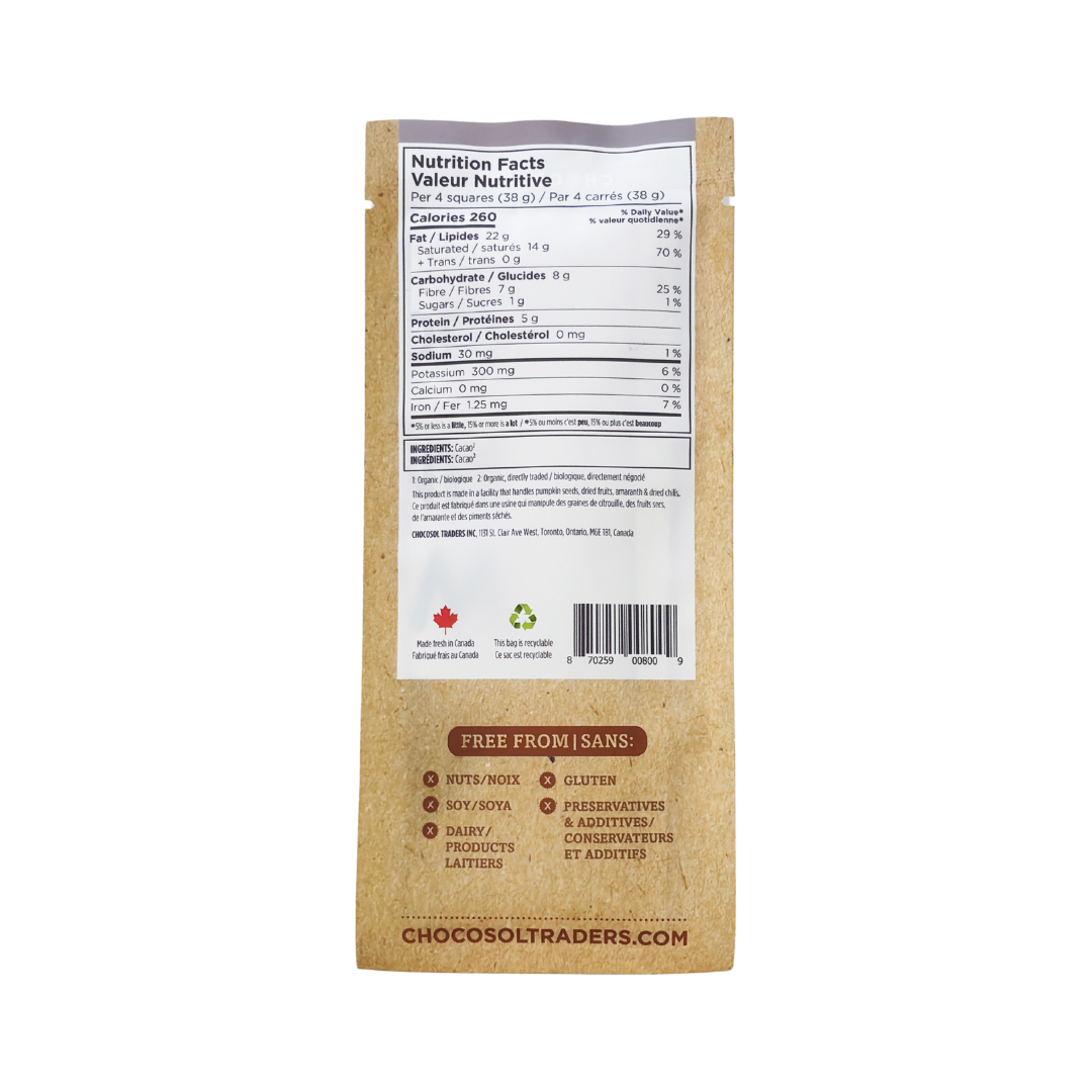 For the cacao purist, this chocolate is for those avoiding all forms of sugar, for those who simply prefer unsweetened chocolate in its richest form, and for those looking for a great baking and cooking chocolate.