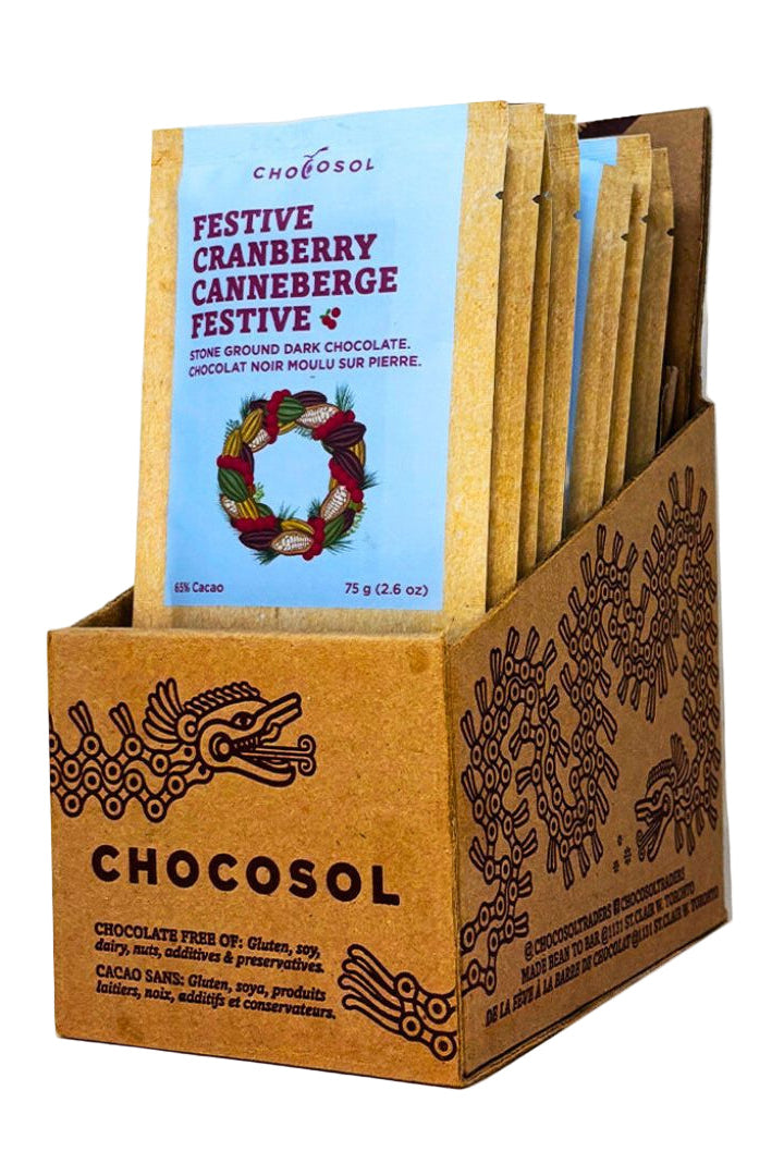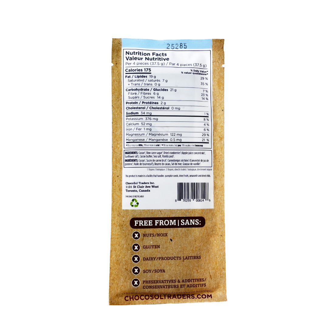 A festive twist on dried fruit + chocolate, this limited-edition bar is embedded with apple-juice infused cranberries for a balanced sweet & sour bite.