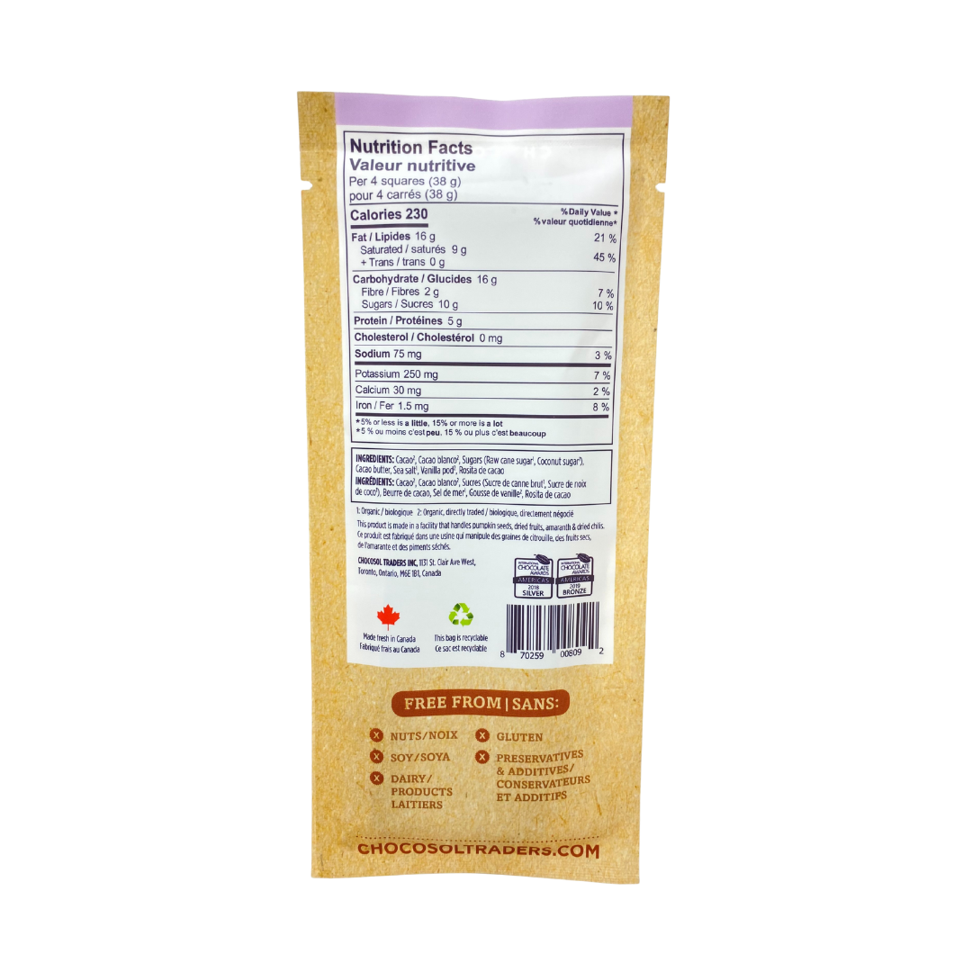 Ingredients: cacao, cacao blanco, sugars (raw cane sugar, coconut sugar), cacao butter, sea salt, vanilla pod, rosita de cacao.
