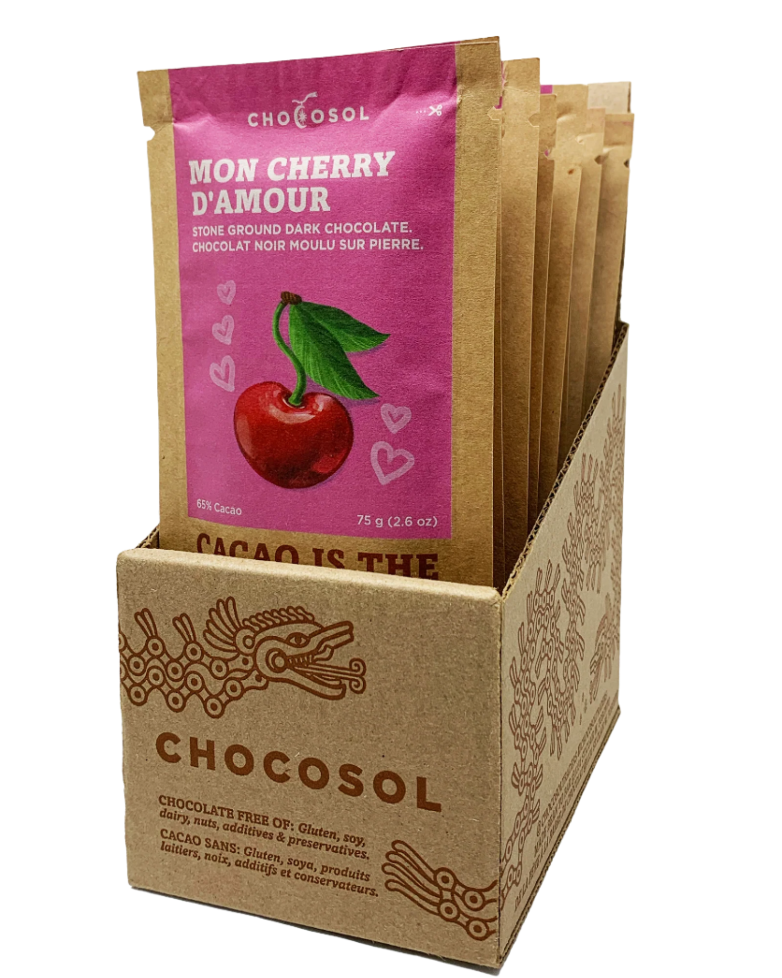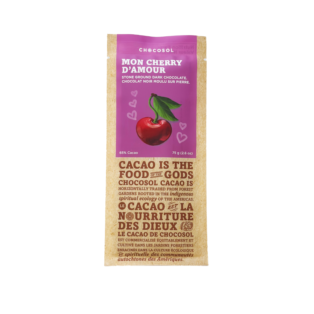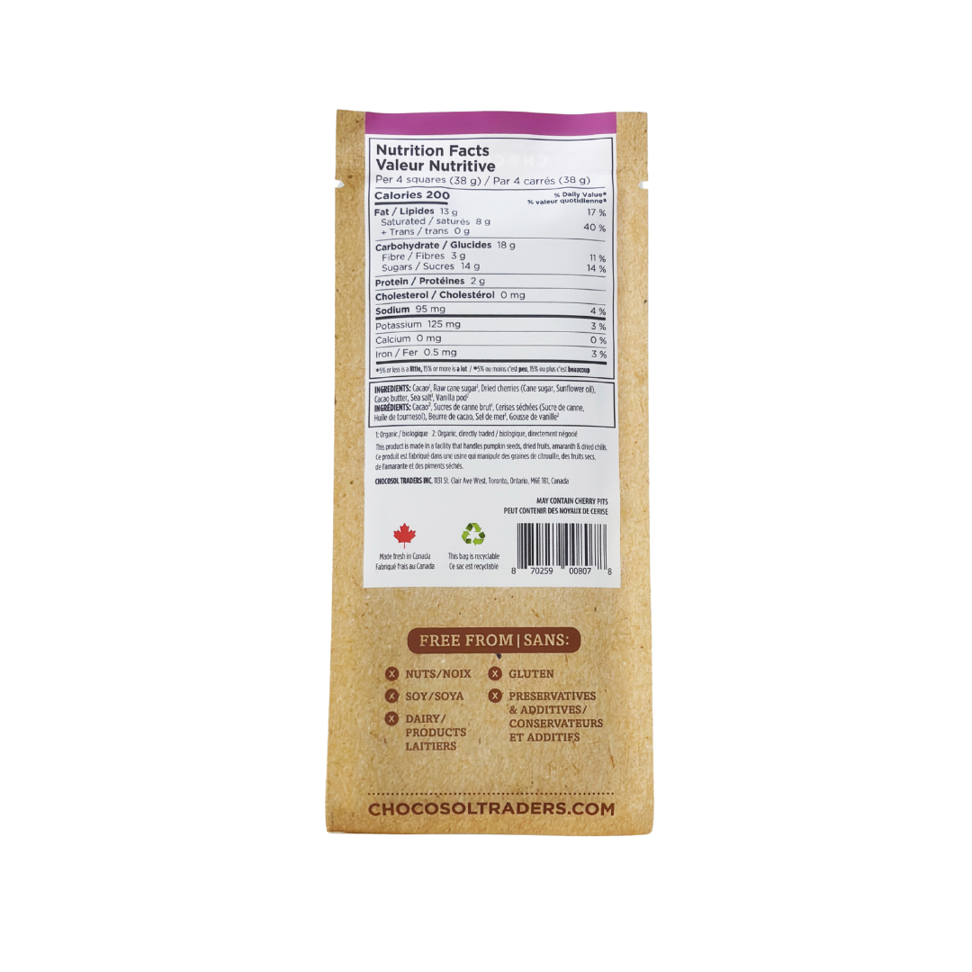 One of our most popular chocolate bars! Made with our crowd-favourite Vanilla Sea Salt 65% dark chocolate &; Canadian-grown cherries.