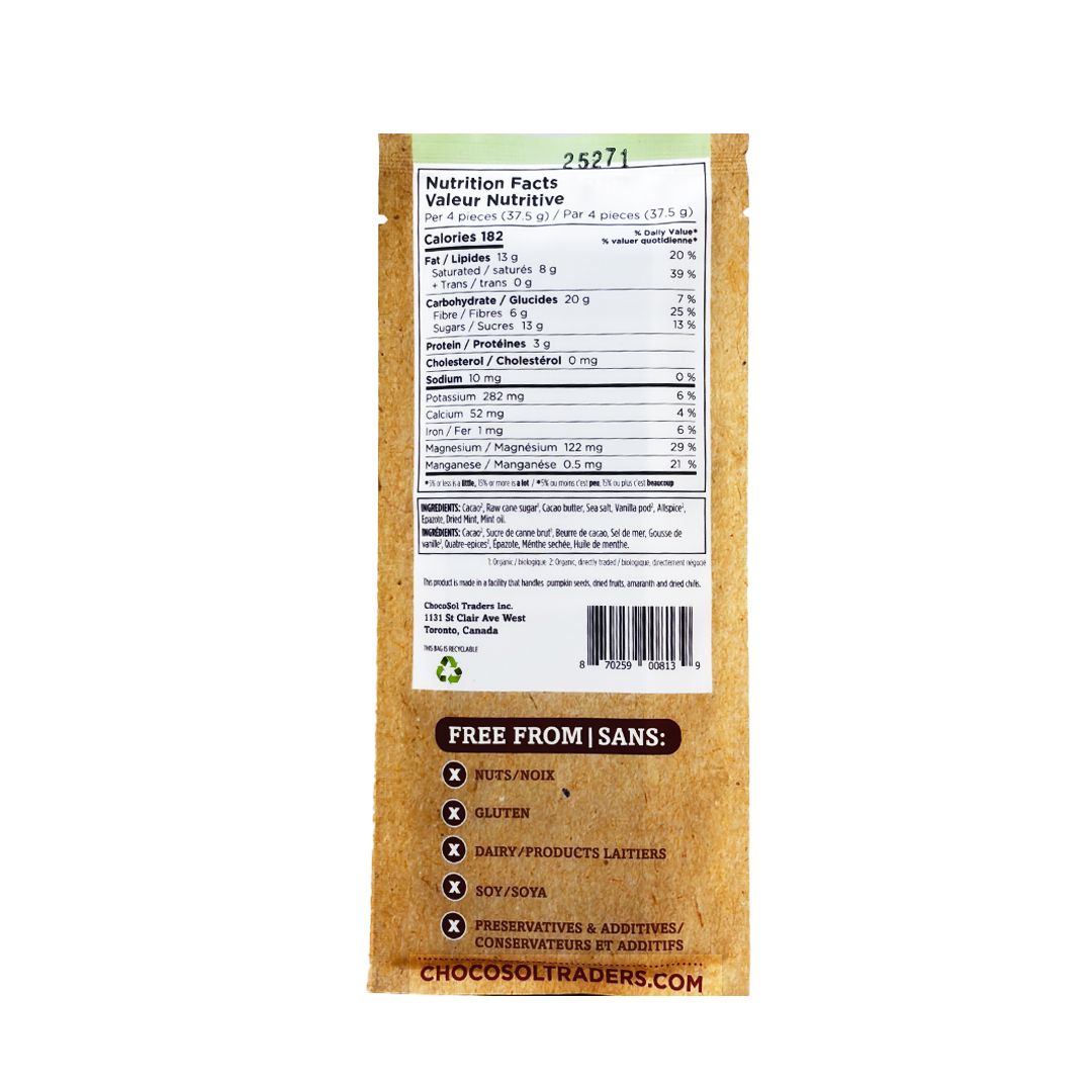 Ingredients: cacao, raw cane sugar, cacao butter, sea salt, vanilla pod, allspice, epazote, dried mint, mint oil.